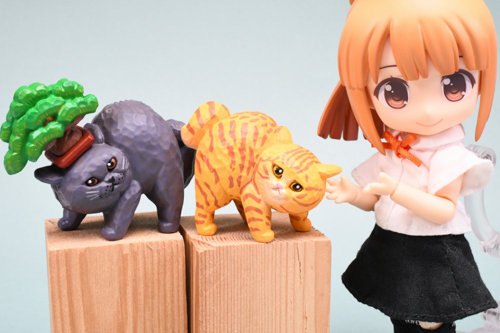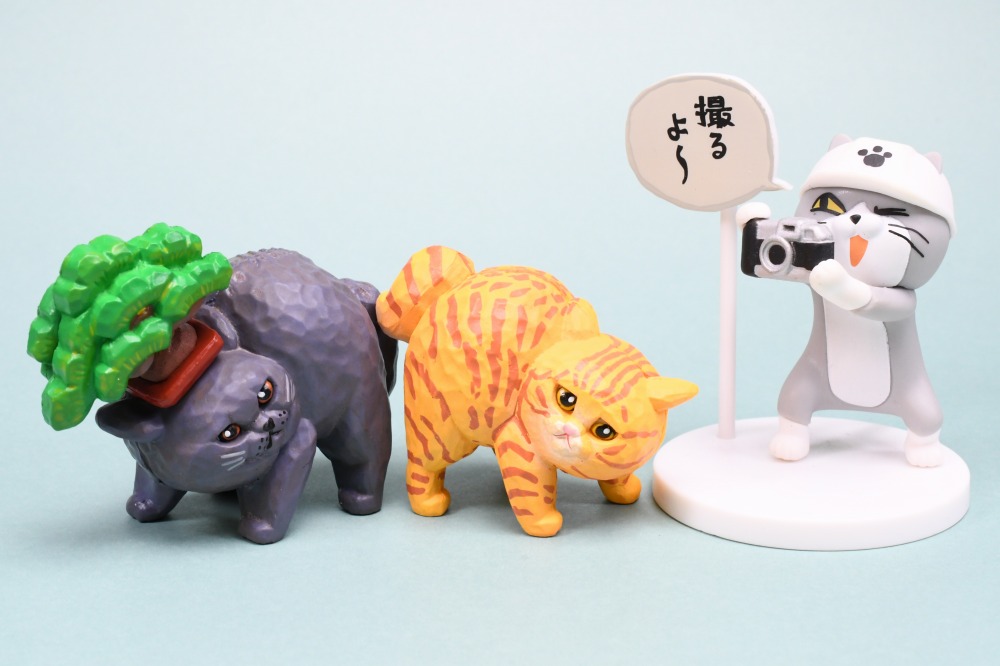 木彫り作家ヒトミコさんが造る頭に色んな物を乗せ、バランスを極める猫達が大集合!